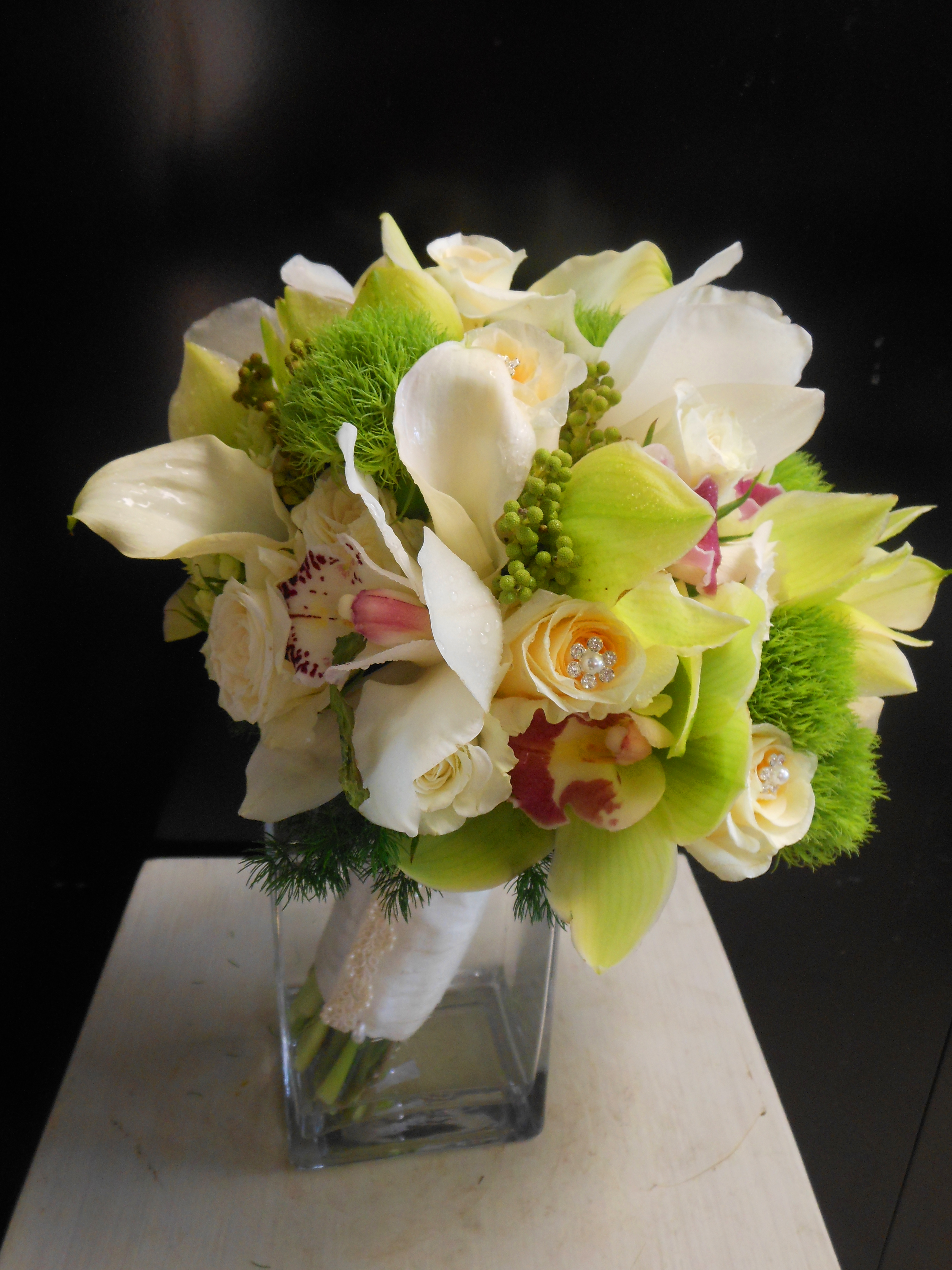 Tara’s bridal bouquet with white callas and cymbidium orchids